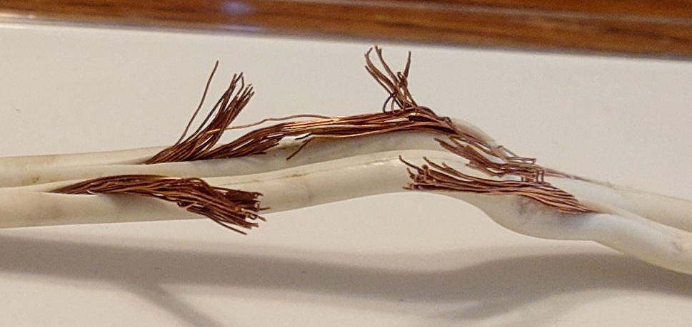 本体側の電源コードと新電源コードの被覆をカッターで分断し